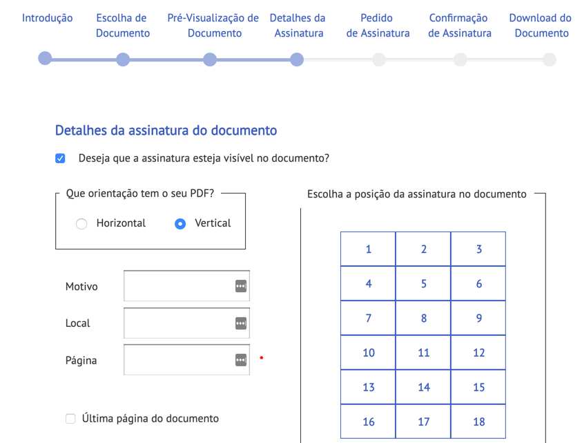 O próximo passo é indicar o posicionamento da sua assinatura. Deverá assim escolher qual a orientação do PDF e a respetiva posição da assinatura no documento. Se o documento tiver mais do que uma página, também poderá indicar em que página pretende.